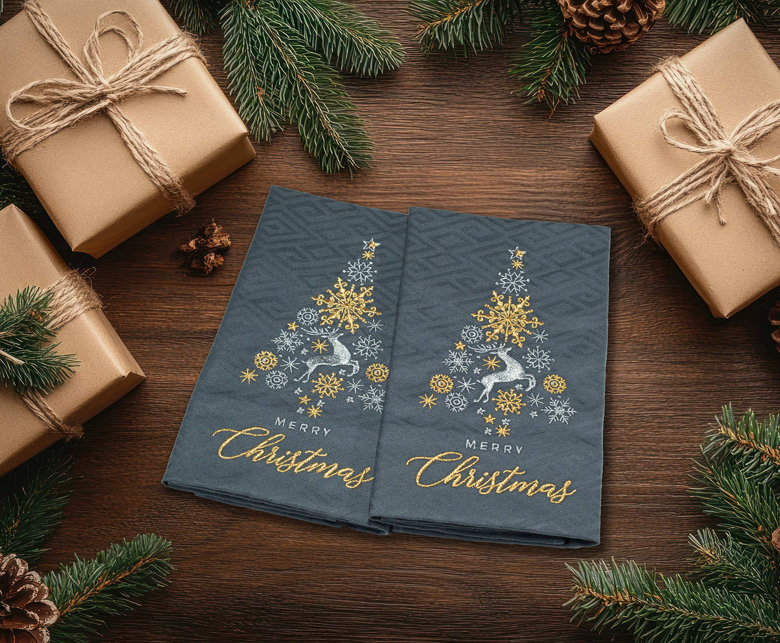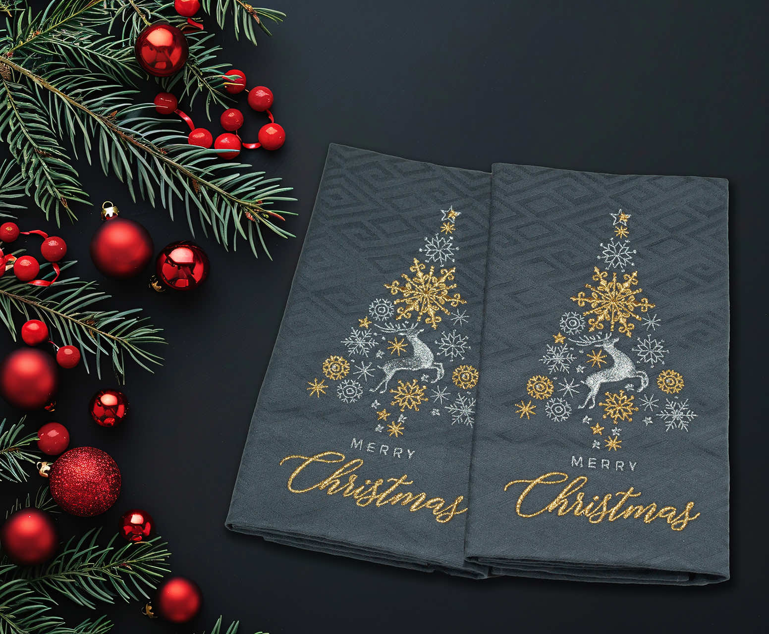 Das zentrale Stickmotiv zeigt einen stilisierten Weihnachtsbaum aus fein geschwungenen Schneeflocken und Sternen, gekrönt von einem anmutig springenden Hirsch. Darunter der elegante Schriftzug „Merry Christmas“. Dezent und edel zugleich fügt sich das Design harmonisch in jede Kücheneinrichtung.