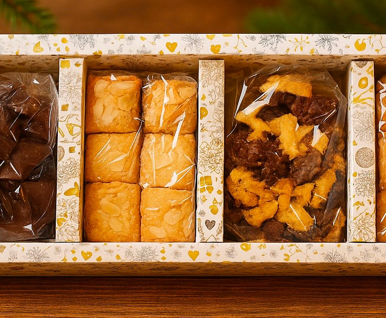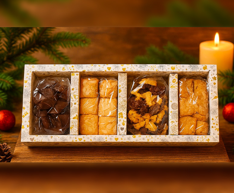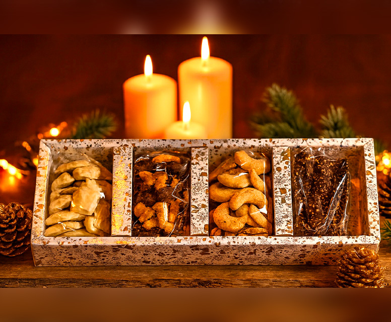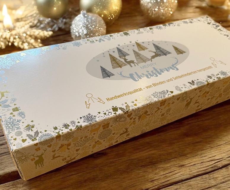 Unser süßer Festtagsgruß vereint exquisite Spezialitäten, die nach traditionellen, liebevoll gehüteten Backrezepten entstehen. Unsere blinden und hochgradig sehbehinderten Handwerker backen dieses Gebäck für unsere Kunden mit viel Hingabe.