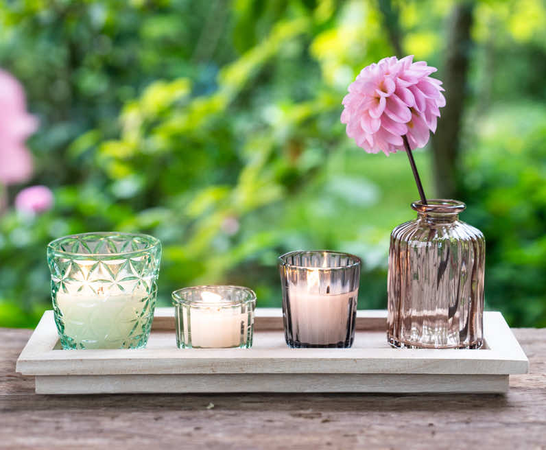 TAVOLA SOLE ist ein dekoratives Licht‑Tablett aus Holz, das als ruhige und elegante Basis für Kerzen, Glasgefäße und florale Elemente dient. Auf dem Holztablett stehen eine Vase sowie ein Ensemble aus drei harmonisch aufeinander abgestimmten Kerzengläsern, deren Farbverlauf von Grau über Lila bis hin zu Grün reicht. Seine klare Form und die natürliche Oberfläche wirken zeitlos und lassen sich vielseitig einsetzen – im Garten, auf der Terrasse, dem Balkon oder im Wohnraum. Für ein grünes und das graue Kerzenglas erhalten Sie zwölf hochwertig gefertigte Teelichter in einer transparenten Kunststoffhülle.