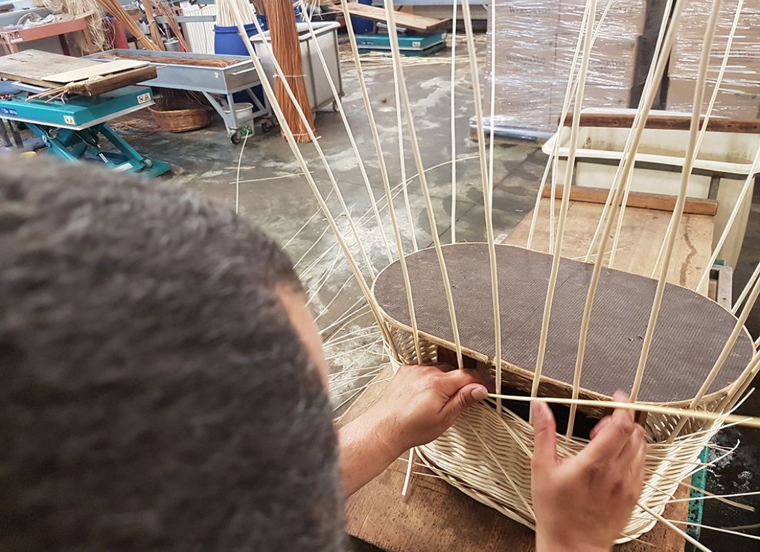 Die Weiden werden durch die Bohrlöcher des Holzbodens gezogen und werden zu einem Rollfuß gebogen und abgeschnitten.Il fait passer les tiges d’osier à travers les trous de la base en bois, puis il les plie pour former une torsade et coupe ce qui dépasse. Vengono poi fatti passare attraverso i fori del pavimento in legno, piegati e tagliati.